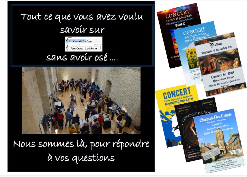 Fondé, sur la base d’une chorale existant précédemment, le choeur DA CAPO a été crée en 2016 à Pont-Croix - d’où son nom qui signifie selon la terminologie musicale que le choeur retourne au tout début de la partition.Autour d’une structure associative, loi 1901, son fonctionnement et son organisation ont été définis en fonction du projet musical porté par le chef de Choeur Yves HERAUD, son créateur.Depuis le début de l'année 2025, elle est dirigée par Serge Médot, qui fait travailler et chanter plusieurs chorales dans le Finistère. Outre des titres sacrés et qulques titres profanes, le champ d'interprétations de Da Capo s'élargit aux airs d'opéra soutenu lors des concerts par Zephirin Causin pianiste, Ornella Bourgeois soprane professionnelle et des solistes du choeur Edith Kerrand et Franck Bouteleux.