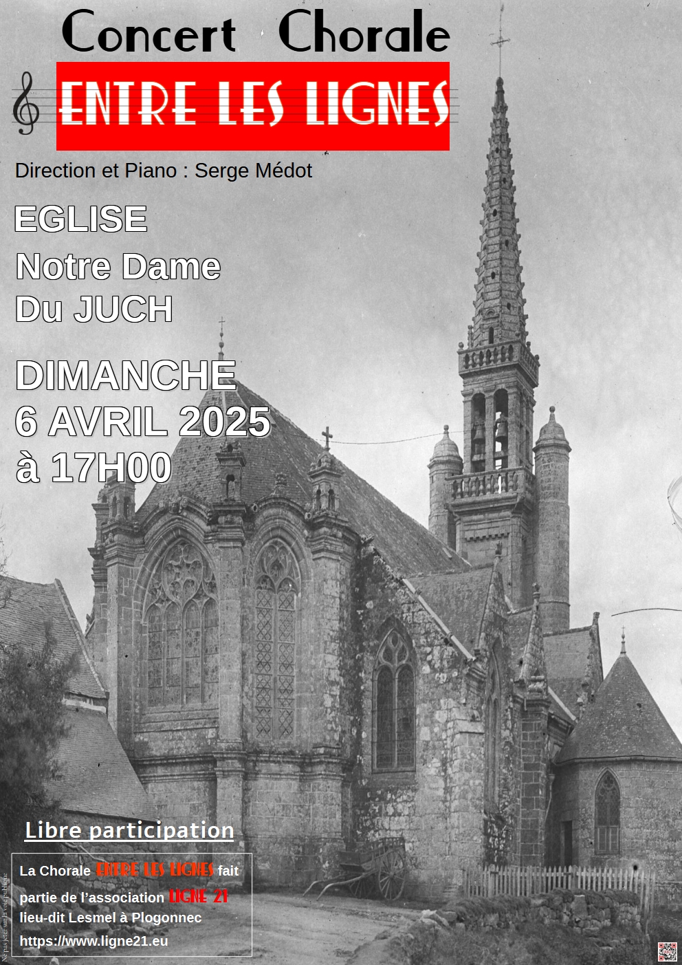 La chorale ENTRE LES LIGNES donnera un concert dans l'église du Juch le dimanche 6 avril à 17h.