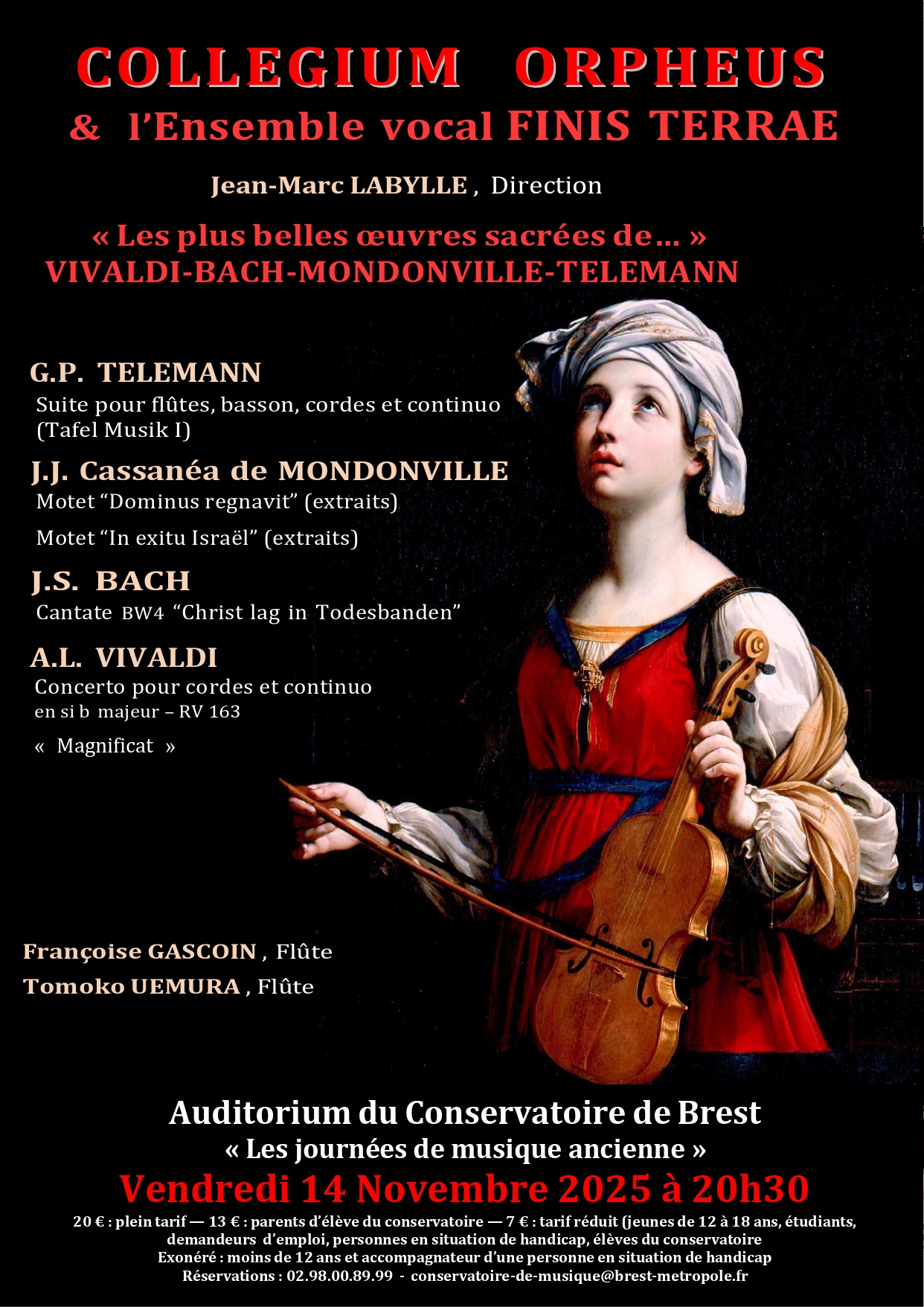 Ce moment musical propose des œuvres sacrées parmi les plus beaux chœurs de la Musique du XVIIIème siècle, magnifiées par les instruments (cordes, flûtes et clavecin) qui s’exprimeront au travers d’un concerto pour cordes de Vivaldi et d’une suite pour deux flûtes de Telemann.