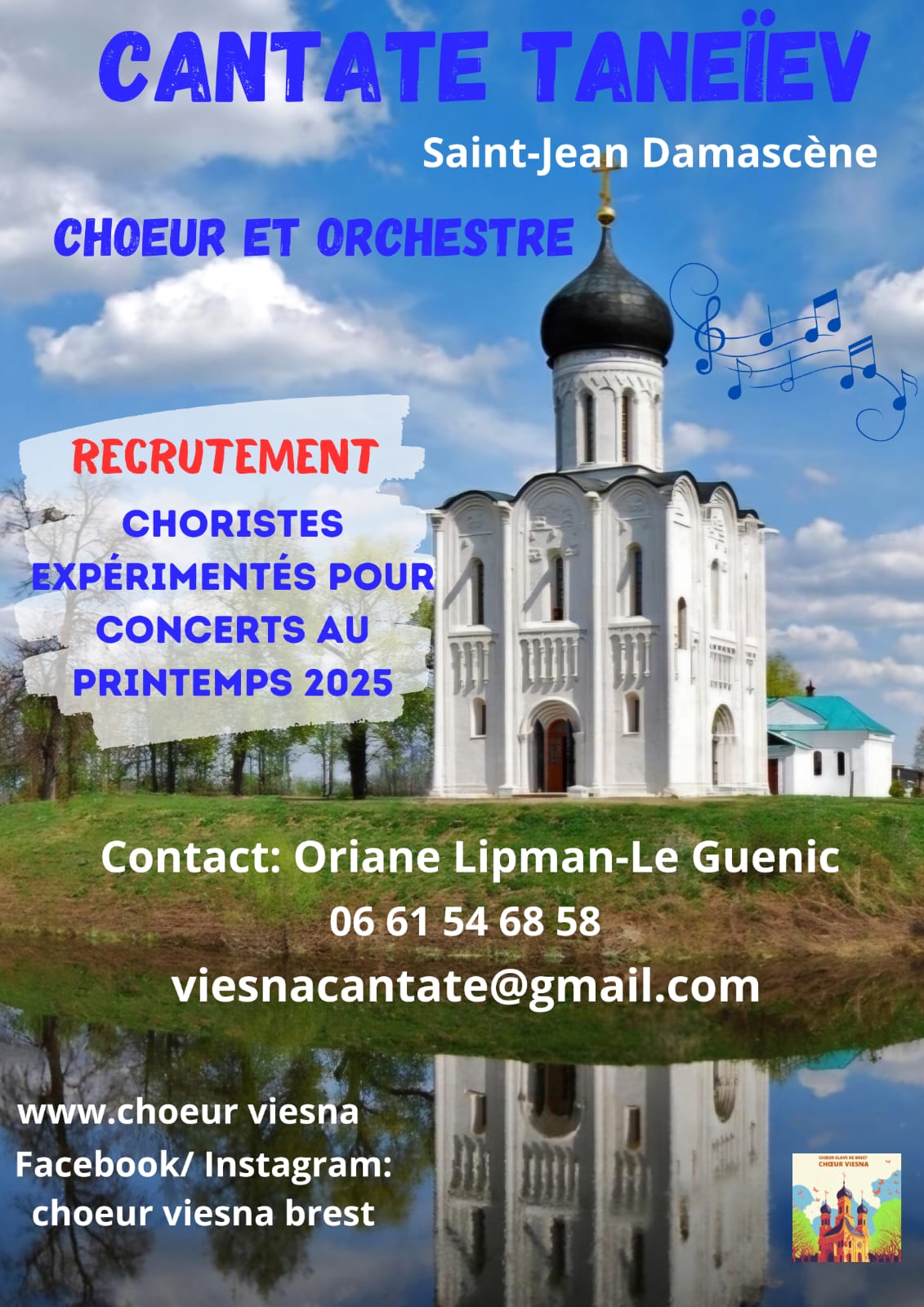 Choeur Slave de 30 choristes basé à Brest recrute choristes expérimenté(e)s tout pupitre pour monter la magnifique Cantate Saint Jean Damascène de Sergueï Taneiev pour choeur et orchestre pour un concert au printemps 2025.