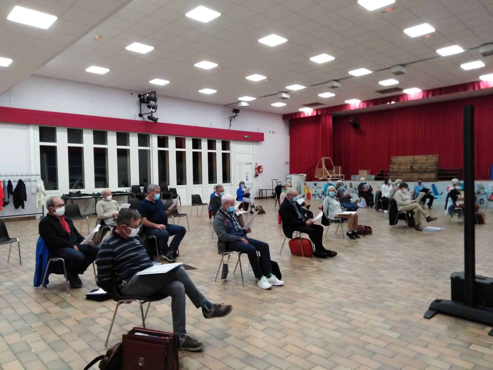 Depuis le 28 septembre, les répétitions du lundi soir ont repris, dans la salle habituelle, mais avec un protocole sanitaire très strict : distance de 2 m entre choristes, port du masque obligatoire, seulement 2 pupitres à chaque fois (35 choristes max), aération avant la répétition et au bout de 45', désinfection, etc.
